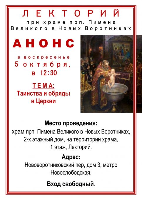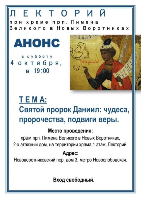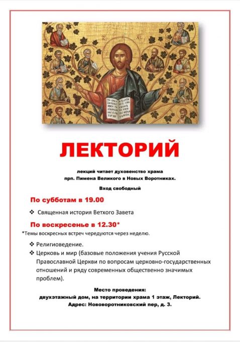 Дорогие братья и сестры! Лекторий храма прп. Пимена Великого продолжает свою работу после перерыва на летние каникулы. Первая субботняя лекция – 4 октября в 19.00, воскресная – 5 октября, в 12.30.