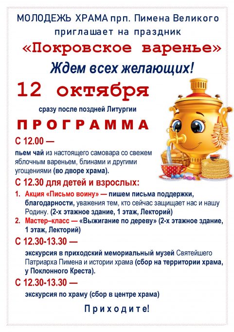 Объявления Молодежь храма прп. Пимена Великого приглашает на праздник «Покровское варенье» 07.10.2025 / Telegram-канал