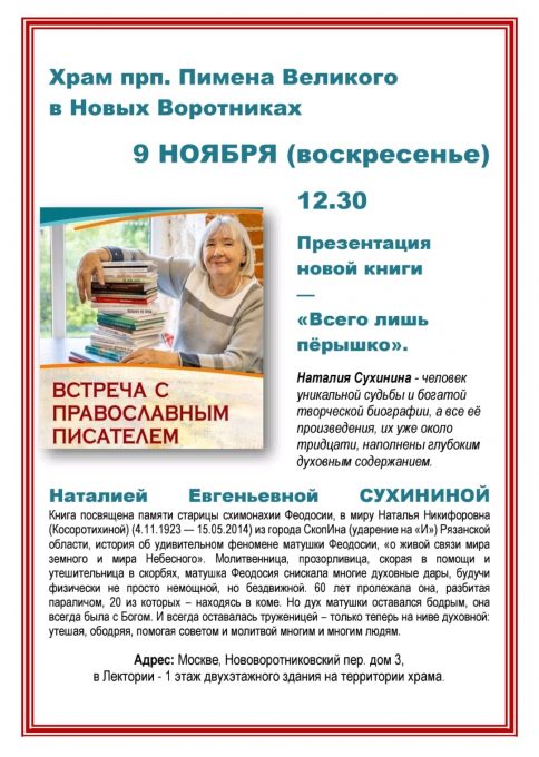 Объявления 9 ноября – у нас в гостях Н. Е. Сухинина с новой книгой “Всего лишь перышко” 01.11.2025 / Telegram-канал